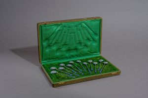 Ivan Vassilievitch Zakarov. Douze cuillères à moka, en argent, vermeil et émaux cloisonnés. Moscou, vers 1896; 10,5 cm. Dans leur coffret couvert de papier lierre à frises dorées, capitonné de soie verte et augmenté d’un présentoir de...