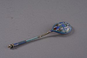 Pavel Ovtchinnikov. Cuillère en argent et émaux cloisonnés. Moscou, 1886. Longueur 15,8 cm. Poids 44 g. ◊ maître orfèvre : [« П.ОВЧИННИКОВ »], poinçon partiel. ◊ aigle impériale (partiel). ◊ essayeur : A.P. (A. Romanov),...