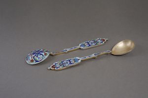 Gabriel Petrovitch Gratchëv. Paire de сuillères. Saint-Pétersbourg, 1866-1873. Vermeil, émaux cloisonnés. 15 cm. Poids 80 grammes. ◊ maître orfèvre : АП ◊ titre : 84, Saint Pétersbourg ◊ firme : ГРАЧЕВЪ ГРАЧЕВ (...