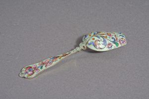Grande cuillère pour le thé, en vermeil et émaux cloisonnés. Moscou, 1896-1908. Longueur 14,3 cm. Poids 41 g. Pas de poinçon de maître orfèvre. ◊ essayeur : 84, fK, ИЛ (?) (Ivan Lebedkin ?). Très jolie teinte pistache. Ложка для...