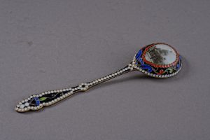 Grande cuillère en argent et émaux cloisonnés. Léningrad (Saint Pétersbourg), 1958. Longueur 17,5 cm. Poids 57 g. ◊ poinçon annuel : ЛФ8 (= 1958). ◊ titre : 916, Kg. Sur le revers du cuilleron, photographie de la cathédrale Saint Issac...