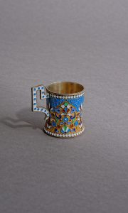 [D. Nikitin ?]. Verre à vodka en vermeil et émaux cloisonnés. Moscou, 1896-1908. Diamètre 3,7 cm ; hauteur 4,3 cm (5 cm avec l’anse). Poids 47 g. ◊ maître orfèvre : ДH. ◊ essayeur : 84, fK, ИЛ (Ivan Lebedkine). Стопка для...