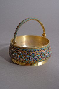 Dmitri Nikolaievitch Nikolaiev. Sucrier à anse, en vermeil et émaux cloisonnés. Moscou, 1908-1917. Diamètre 11 cm ; hauteur 5,5 cm (12 cm avec l’anse). Poids 224 g. ◊◊ maître orfèvre : ДН. ◊ essayeur : ∆ (Moscou), Kg, 84. ◊◊...