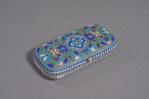 Gustave Klingert. Etui à cigarettes en argent, vermeil et émaux cloisonnés. Moscou 1884. 10 x 5,5 x 2 cm. Poids 151 g. ◊ maître orfèvre : GK (en latins). ◊ titre : 84, Moscou. ◊ essayeur : В. П (Vassili Petrov), 1884 / 84 /...