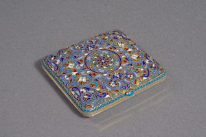 Gustave Klingert. Etui à cigarettes. Moscou, 1893. Vermeil et émail cloisonné. 8 x 9 x 1,5 cm. Poids 163 g. ◊◊ maître orfèvre : GK (en latins). ◊ titre : 84, Moscou. ◊ essayeur : A. C. (Alexandre Alexeevitch Smirnov), 1893 / 84 /...