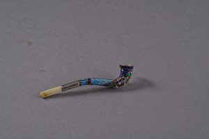 Pipe en argent et émaux cloisonnés. Russie, vers 1900. Argent, vermeil, émaux cloisonnés ; embout en ivoire. 9,5 x 2 cm. Embout en argent (vers 1930) : ◊ Kg ◊ titre : Kg, 916 ◊ И30. Трубка. Россия, ок.1900. Серебро,...