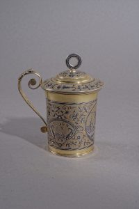 Tasse couverte en argent niellé & vermeillé, à décor de rinceaux fleuris et d’un médaillon représentant un cavalier sabre au clair chevauchant sur les nuages. Moscou, 1810-1820. Argent & vermeil. Hauteur 14,5 cm. ◊◊ maître-orfèvre : A...