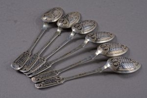 Ivan Ivanovitch Futikin. Six petites cuillères en argent niellé et vermeil. Moscou, 1867. 14 cm. ◊ maître orfèvre : И Ф. ◊ essayeur : В. С (Victor Savinkov), 1867 / 84 / Moscou. И.ФУТИХИН. Шесть чайных ложек....