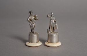 Deux statuettes (personnages populaires de Russie) : • le vendeur de thé • la porteuse d’eau. Saint Pétersbourg (?), vers 1850. Argent & vermeil ; sur un socle d’ivoire tourné. Hauteur 6,5 cm. Poids : 101 grammes. ◊ maître orfèvre :...