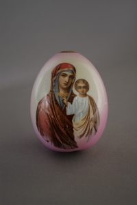 Œuf de Pâques, en porcelaine à décor polychrome. Russie, manufacture de Kuznetzov (?), XIXe s. Porcelaine blanche, peinte et dorée ; hauteur : 10 cm ; diamètre : 8 cm. Poids : 154 grammes. Face principale : la Vierge Marie porte l’Enfant...