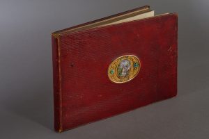 Том in-8° продолговатого формата в красном марокеновом переплете с фарфоровым живописным медальоном в бронзовом обрамлении в центре первой крышки.