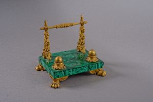 Porte-plume de bronze doré sur socle en placage de mosaïque de malachite. Probablement Russie, XIXème s. 15,5 x 14 x 11 cm. Настольная подставка для пера. Россия, 1ая половина XIX...