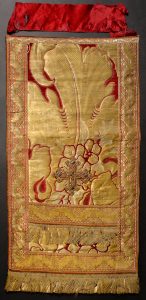 Nabedrennik. Ornement liturgique. Russie, vers 1880. Broderie de fils d’or et d’argent ; doublure de soie. 80 x 40 cm. Attache de soie déchirée. Cet ornement nommé nabedrennik était porté par certains clercs lors des cérémonies...
