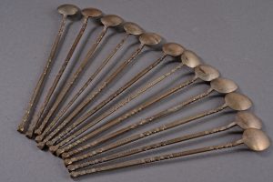 Ensemble de douze cuillères à thé, à long manche ouvragé. Russie, vers 1860. Métal. Longueur : 20 cm. Peut-être un travail en marge de la Manufacture impériale de Toula. Двенадцать ложек. Россия, ок.1860....