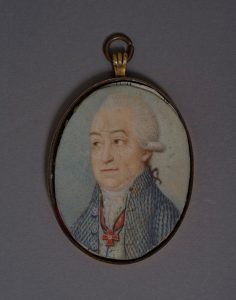 Portrait d’un homme en tenue civile, portant la croix de l’ordre de Saint Vladimir. Russie, vers 1790. Miniature sur ivoire. 6,5 x 5 cm. Sous vitre, dans un cerclage de laiton. Русская школа. Портрет дворянина с...