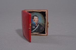 Portrait d’un officier russe en uniforme de Hussards, portant au col la croix de l’ordre de Sainte Anne sertie de diamants. Russie, vers 1815. Miniature sur ivoire (4,7 x 4 cm) ; sous vitre, dans un écrin porte-image maroquiné rouge (5,5 x 5 x...