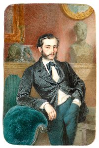homme, portant de longs favoris, est vêtu d’une veste sombre et porte une cravate. Il est accoudé sur le montant d’un canapé, dans un intérieur richement meublé où se distinguent un buste de marbre (l’empereur Nicolas 1er ?), une coupe de cristal et une sculpture d’éléphant, ainsi que deux cadres accrochés au mur.