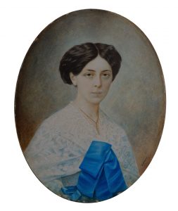 Alexandre Wegner. Portrait en buste d'une jeune femme au ruban bleu. Vers 1850. Grande miniaure sur ivoirine ovale (24 x 19 cm) dans un cadre en bois doré. Signée sur la bordure gauche en caractères cyrilliques. Superbe portrait d’une femme...