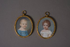 Portait de Mikhail Vladimirovitch Mezentsoff & de Natalia Vladimirovna Mezentsova. Russie, vers 1824-1825. Deux miniatures ovales sur ivoire (6 x 5 cm) ; sous vitre, dans un cerclage de laiton doré. Au dos de chaque, étiquette d'époque indiquant...
