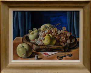 présente trois pommes et une grappe de raisin blanc ; une quatrième pomme est posée sur la table ainsi qu’un dé à coudre, une clé et une enveloppe glissée sous le plateau et dont on aperçoit le timbre rouge à l’effigie féminine.