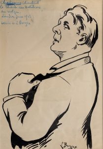Louis Bourgeois-Borgex. Chaliapine chantant. [Londres, 1929]. Encre de Chine sur traits de crayon, signé «L Borgex» en bas à droite. Inscription dans l’angle supérieur gauche «Chaliapine chantant le chant des bateliers du volga. Londres juin...