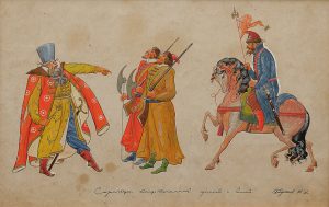 Paul Bajenov. Strel'tsy : Deux gardes, suivis d’un troisième à cheval, se font réprimander par leur chef. 1936. Vaste miniature (aquarelle & gouache) sur feuille de papier (20,5 x 32 cm à la vue) ; sous vitre. Légendé, signé & daté à...
