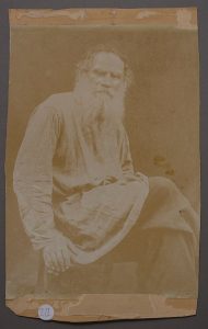 Portrait de Léon Tolstoï assis, vers 1890-1900. Tirage photographique (25 x 18 cm) contrecollé sur carton. Лев Николаевич ТОЛСТОЙ. Фотографический портрет....