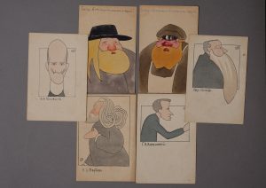 Six aquarelles montées en carte postale. Russie, début XXe siècle. Monogrammées VC. • Deux représentant des types russes. • Quatre représentant chacunes un homme politique de l’époque. Шесть акварелей в виде...