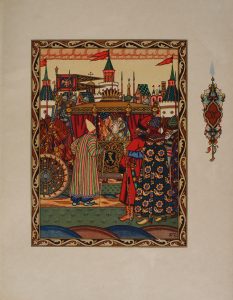 Alexandre Sergueievitch Pouchkine. Le coq d’or et d’autres contes. Paris, H. Piazza, 1925. Deux volumes in-4°, l’un broché & l’autre en feuilles sous chemise, réunis dans un étui cartonné. Traduit par N. Andréiéff. Illustré par Boris...
