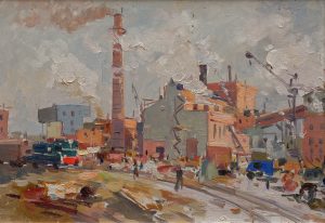 I. Mednikova. La construction de Kouznetsk. 1956. Huile sur carton, 35 x 49,5 cm, dans un cadre moderne. И. Медникова. Стройка Кузнецка. 1956. Картон, масло, 35 х 49,5 см, в современной раме.