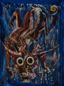 Синий холст, гуашь, 101 х 78 см, подписан, датирован слева вверху.