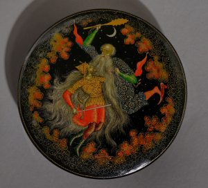 Vladimir Kotukhine. Boîte ronde. Rousslan & Tchernomor. Palekh, 1931. Papier mâché, laqué et peint. 9 x 2,3 cm. Signé et daté en bas à droite. Vladimir Kotukhin (1897-1957), se forma comme peintre d’icônes à Palekh. En raison de la...