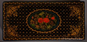 M. Onasienko. Boîte rectangulaire. Bouquet de fleurs. Mstiora, 1947. Papier mâché, laqué et peint. 8,5 x 17,5 x 4,3 cm. Signé en bas à droite, localisé et daté en bas à gauche. Fond laqué noir, intérieur rouge...
