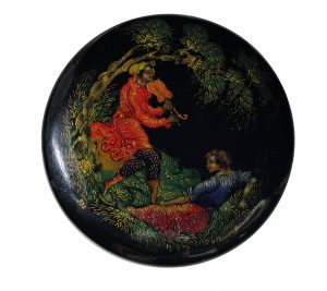 Ivan Golikov. Boîte ronde. La sérénade du gars pour sa belle. [Palekh], 1930. Papier mâché, laqué et peint. 4,7 x 1,5 cm. Signé & daté en bas. Fond laqué noir, intérieur rouge bordeaux. Иван Голиков. Свидание....