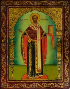 Tatiana Andriachkina. Saint Nicolas le Thaumarturge. Palekh, 2000. Татьяна Андриашкина. Святой Николай Чудотворец.Laque peinte. 14,5 x 11,5 cm. Titré, localisé, daté & signé au dos. Fond laqué...
