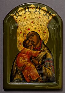 Ekaterina Feodorovna Schanitsyna. Vierge à l’Enfant. Palekh, 2002. Екатерина Щаницына. Образ Божией Матери "Избавление от бед страждущих". Laque, tempera & or sur panneau (10,8 x 8,8...