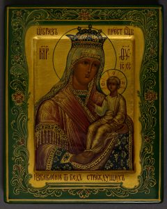S. Timovski. Vierge à l’Enfant, de Vladimir (“Vladimirskaya”). Palekh, sd (vers 1995). С.Тимовский. Владимирская Божия Матерь. Laque, tempera & or sur panneau (10 x 7 cm). Signé et daté au dos.