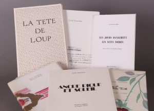 La Table des Champs, 1982. Plaquette in-8, brochée. Un des 120 exemplaires numérotés de l'édition originale. Envoi autographe signé de Scutenaire à la famille Deknop. Bel exemplaire. Joint : SCUTENAIRE. Ancre pique et soleil. Illustrations originales de Françoise Gérard. Paris, Rive Gauche, 1973. Grand in-8, broché. Illustré en couleurs. Exemplaire d'auteur de l'édition originale, avec une lithographie. Envoi autographe signé de Scutenaire à la famille Deknop. Bel exemplaire. Joint : SCUTENAIRE. La Tête du loup. Illustrations de Roger Dethier. Le Gré du Comte, 1983. Plaquette in-8, en feuilles. Un des 50 exemplaires numérotés sur papier vélin d'Arches.Envoi autographe signé de Scutenaire à la famille Deknop. Bel exemplaire. Joint : SCUTENAIRE. Les Jours dangereux les nuits noires. Quatre dessins de Claudine Jamagne. Bruxelles1972. In-8 broché. Envoi autographe signé de Scutenaire à la famille Deknop. Bel exemplaire. Joint : SCUTENAIRE. La Cinquième saison. La Pierre d'alun, 1983. In-8 en feuilles. Illustré. Exemplaire numéroté. Envoi autographe signé de Scutenaire à la famille Deknop. Bel exemplaire. Joint : SCUTENAIRE. Le Monument de la guenon. Edition augmentée. Bruxelles, 1979. In-8 broché, non coupé. Envoi autographe signé de Scutenaire à la famille Deknop. Bel exemplaire.