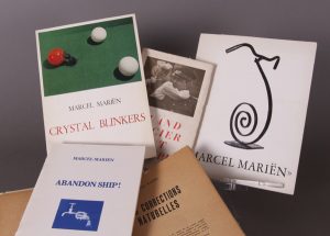 Bruxelles, Librairie Sélection, 1947. In-8 (23,5 x 15,5), broché. Couverture illustrée par Magritte, et un dessin in-texte. Envoi autographe signé de Mariën à M. et Mme Thirifays à l'encre noire à la page de garde. Il s'agit sans doute d'André Thirifays, journaliste et principal fondateur de la Cinémathèque de Belgique. Bel exemplaire de l'édition originale. Joint : MARIËN (M.) Crystal blinkers. Harpford, s. d. In-8, illustré. Un des 100 exemplaires numérotés de l'édition originale. Envoi autographe signé de Marcel Mariën à Evelyn et Georges Deknop. Bel exemplaire. Joint : MARIËN (M.) Abandon ship! Harpford, 1984. Plaquette in-8. Illustrée. Envoi autographe signé aux Amis Deknop, de 1985. Joint : MARIËN (M.) Quand l'acier fut rompu. Bruxelles, Les Lèvres Nues, 1957. Petit in-8, broché. Bel exemplaire de l'édition originale. Joint : MARIËN (M.) Anch'io non son pittore! Rétrospective et nouveautés. 1937-1967. Catalogue Galerie Defacz, Bruxelles. Illustré.