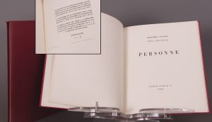 Paris, Georges Visat et Cie, 1962. In-folio (31 x 25,5), pleine toile framboise, pièce de titre maroquin brun en long au dos, étui. Illustré de figures fluides gravées en couleurs par Dorothea Tanning (i. e. 9 planches, dont les 8 premières ont été coupées deux fois dans la hauteur). Un des 11 exemplaires sur vélin d'Arches (n° H. C. V; tirage total 91 exemplaires), signé par l'artiste et la poète à la justification. Dos légèrement insolé, sinon bel exemplaire.