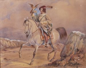 [Ecole anglaise]. Edward HULL. Couple de fauconniers à cheval. Ens. 2 pièces.