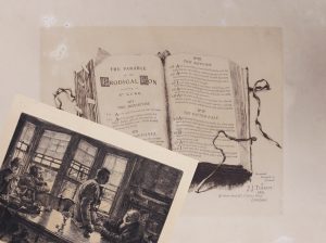 Invented, Painted & Etched by J. J. Tissot, 1881. 17, Grove End Rd St John's Wood, London. 4 gravures 31 x 37,2, sur Hollande 50 x 61,5, et le titre gravé, du même format, sur une double feuille format farde. James Tissot, peintre et graveur français né à Nantes (1836-1902), vécut longtemps en Angleterre où il connut beaucoup de succès auprès de la haute société victorienne; "actualisation" de la parabole. Quelques taches claires au titre, sinon bel exemplaire.