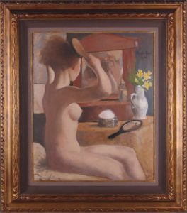 Huile sur carton, 55 x 45. Signée et datée "Rassenfosse. 1932" en haut à droite. Au dos de l'œuvre, de la main de l'artiste : "cette peinture est cirée et ne doit jamais être vernie. Rassenfosse. 1933". Sous verre, dans un cadre doré soigné. (Tableau reproduit dans l'ouvrage : Joost De Geest, dir., Armand Rassenfosse, Editions Racine, 2005). Peinture réalisée dans la plénitude du talent d'Armand Rassenfosse. La date "1932" désigne le moment où il a considéré l'œuvre achevée (et "1933" l'année où il s'en est défait). Des thèmes récurrents apparaissent (la toilette, le reflet dans le miroir, les gestes…), et des objets reproduisent sont conservés dans sa demeure rue Saint-Gilles à Liège (comme le miroir).
