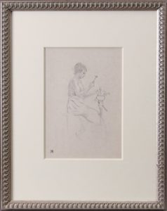 Dessin à la plume, 21,5 x 15. Cachet postérieur en bas à gauche. En très belle condition. Sous verre et passe-partout, cadre vieil argent.