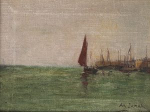 Huile sur toile, 26 x 34. Signée et datée "Ar. Jamar. 1938" en bas à droite. Dans un cadre couleur acajou à filets dorés. Peintre expressionniste né à Liège en 1870 et mort à Saint-Gilles (Bruxelles) en 1946. D'abord juriste, il suit les cours de l'Académie de Liège. Il voyagea beaucoup (Arto).