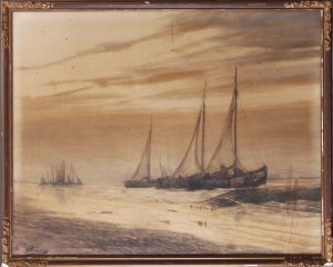Fusain, 73 x 93. Signé "G. Vermeire" en bas à gauche. Papier lég. bruni et quelques taches. Sous verre, cadre doré (petits accidents au cadre). Peintre, aquarelliste et dessinateur autodidacte de paysages, vues de plages et marines. Né à Gand en 1877 et mort à Bruxelles en 1947 (Arto).