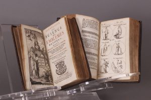 A Amsterdam, chez Adrian Braakman, 1698. 2 vol. Petit in-8 (16,5 x 10), plein veau ancien, dos à 5 nerfs, compartiments ornés, titre gravé, page de titre imprimée en rouge et noir, (24)-264 p., et titre gravé, page de titre imprimée en rouge et noir, p. 265 à 550-(12) p. (catalogue de livres nouveaux d'Adrian Braakman). Illustré de 80 planches hors texte, comprenant chacune six figures. Ouvrage traduit de l'italien de César Ripa par Jean Baudouin (1590-1650), élu à l'Académie Française en 1640. Bel exemplaire.