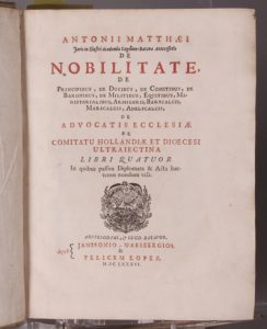 MATTHAEI (Antonii). De Nobilitate, de Principibus, de Ducibus, de Comitibus, de Baronibus […] de advocatis Ecclesiae, de comitatu Hollandiae et dioecesi ultraiectina. Libri quatuor. In quibus passim Diplomata et Acta hactenus nondum vita.