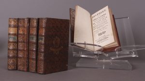 A Lyon, chez Faucheux, Imprimeur-Libraire, quai et maison des Célestins, 1779. 5 vol. Petit in-8 (17 x 10), plein veau fauve de l'époque, dos à 5 nerfs, compartiments ornés, Armoiries de C. F. de Leducq 1786 au premier plat, et H. P. de Coune 1786 au second, tranches rouges. Intérieur frais. Ex-dono manuscrit ville de Liège 1786 à la première garde, à Robert de Rouveroy, de Wandre. Sauf des usures aux plats (et manque la moitié du cuir au premier plat du troisième tome), et aux armoiries, et traces d'humidité aux f. du troisième tome, bon exemplaire.