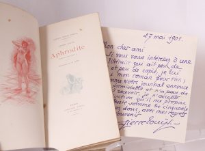 Paris, Librairie Borel, 1896. Petit in-8 (19,5 x 9,5), demi-chagrin et coins rouge, dos à 5 nerfs ornés de roulette dorée, fleurons aux compartiments, tête dorée, 392 p. Illustré par Calbet. Bel exemplaire. Enrichi d'un billet autographe signé de Pierre Louÿs à M. Edouard Dujardin, du 27 mai 1901.